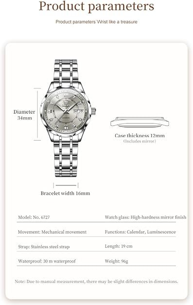 This women's watch is designed with a focus on elegance and practicality. The automatic movement not only provides accurate timekeeping but also eliminates the need for battery replacements, making it an environmentally friendly choice. The watch requires a simple manual winding of the crown for initial use, ensuring you're always on time once you’ve set it up. The diamond markers add a luxurious touch, catching the light beautifully. The 30M water resistance allows for everyday use without worrying about splashes, making it a practical addition to your wardrobe.